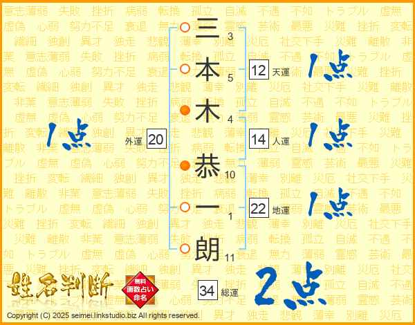 三(3画)本(5画)木(4画) 恭(10画)一(1画)朗(11画)