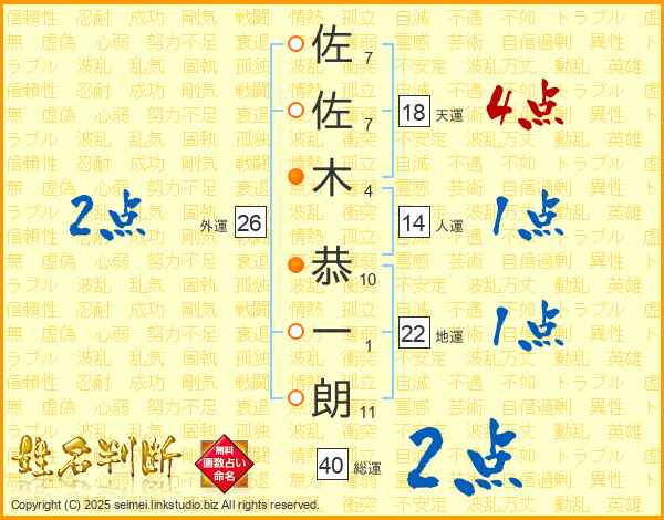 佐(7画)佐(7画)木(4画) 恭(10画)一(1画)朗(11画)