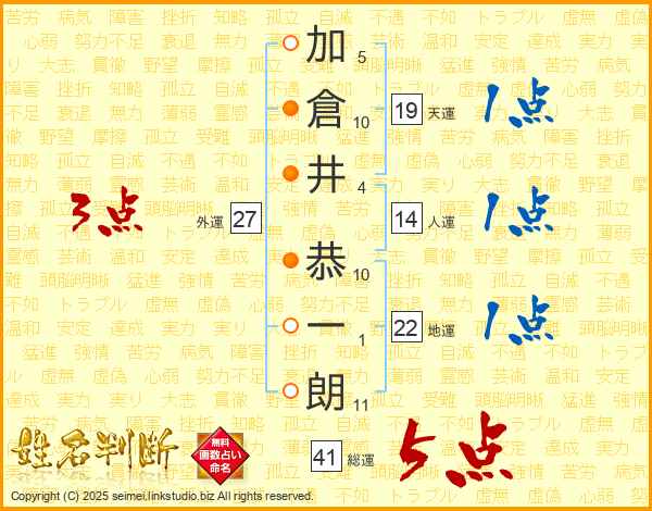 加(5画)倉(10画)井(4画) 恭(10画)一(1画)朗(11画)