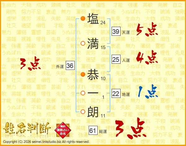 塩(24画)満(15画) 恭(10画)一(1画)朗(11画)