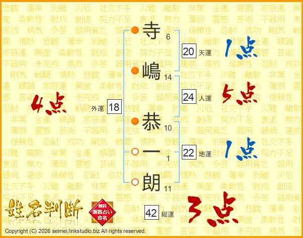 寺(6画)嶋(14画) 恭(10画)一(1画)朗(11画)