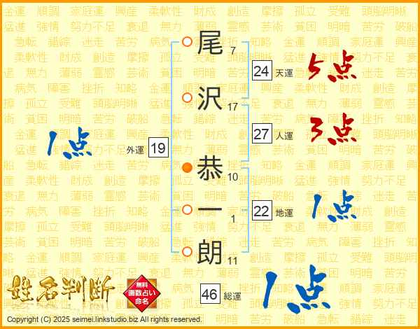 尾(7画)沢(17画) 恭(10画)一(1画)朗(11画)