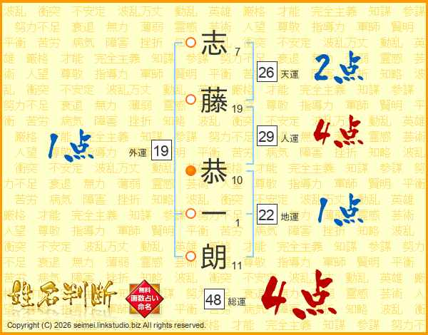 志(7画)藤(19画) 恭(10画)一(1画)朗(11画)