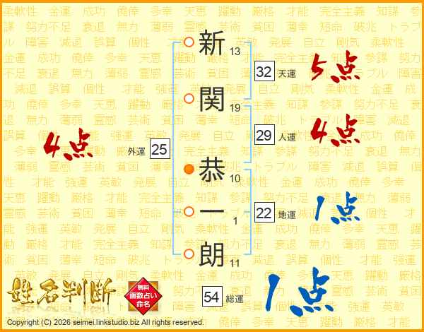 新(13画)関(19画) 恭(10画)一(1画)朗(11画)