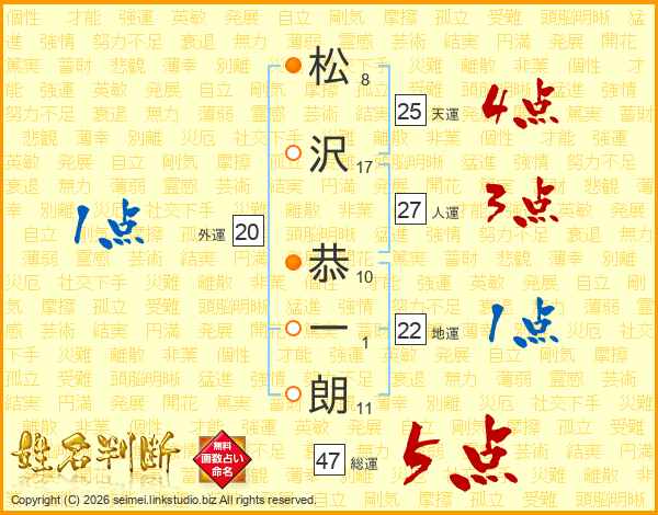 松(8画)沢(17画) 恭(10画)一(1画)朗(11画)