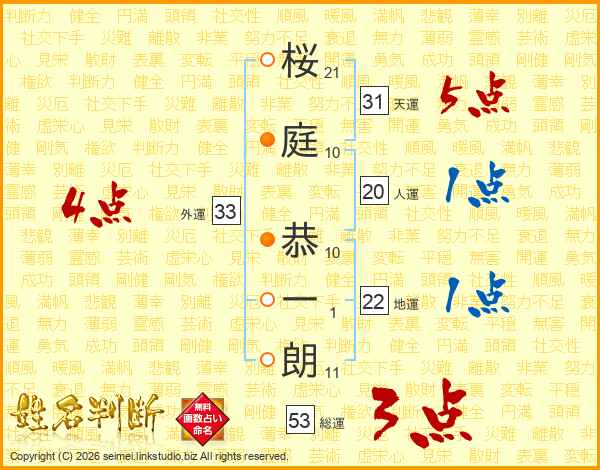 桜(21画)庭(10画) 恭(10画)一(1画)朗(11画)