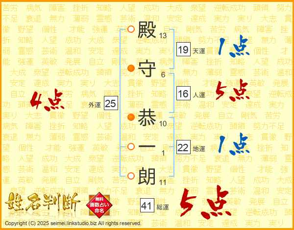 殿(13画)守(6画) 恭(10画)一(1画)朗(11画)