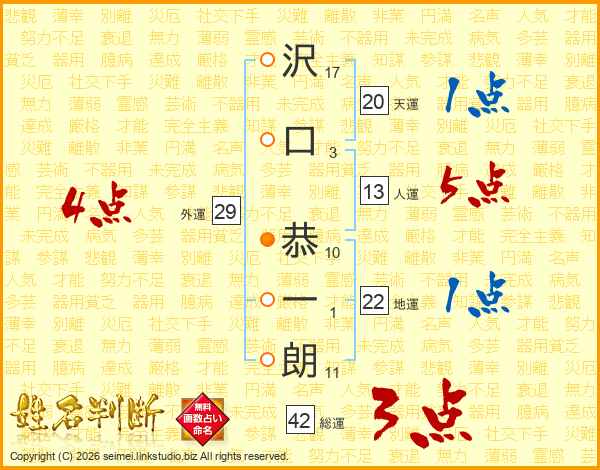 沢(17画)口(3画) 恭(10画)一(1画)朗(11画)