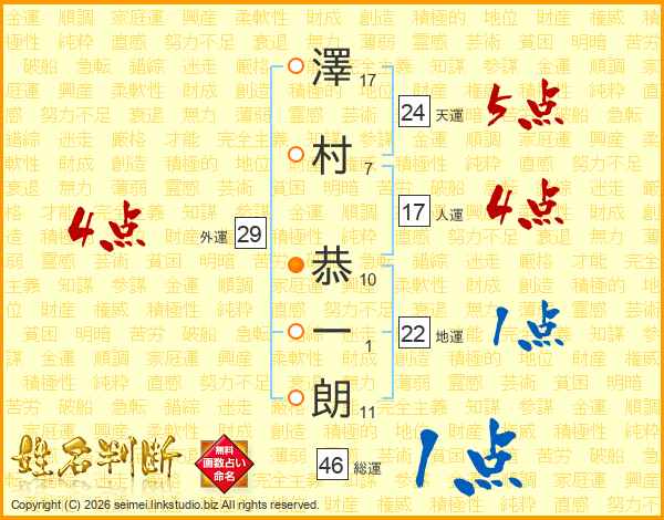 澤(17画)村(7画) 恭(10画)一(1画)朗(11画)