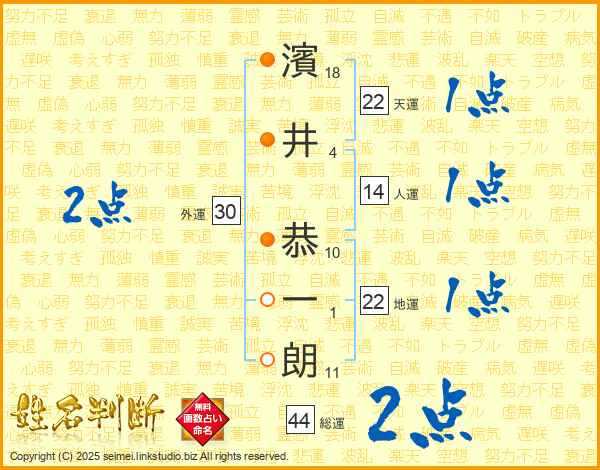 濱(18画)井(4画) 恭(10画)一(1画)朗(11画)