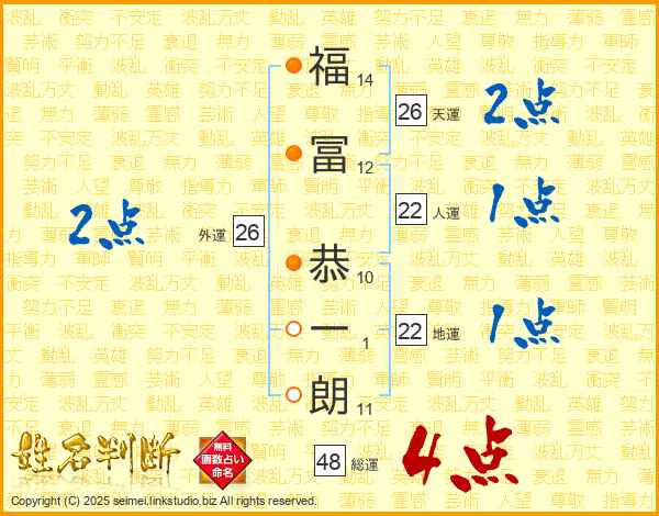 福(14画)冨(12画) 恭(10画)一(1画)朗(11画)
