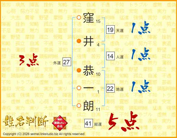 窪(15画)井(4画) 恭(10画)一(1画)朗(11画)