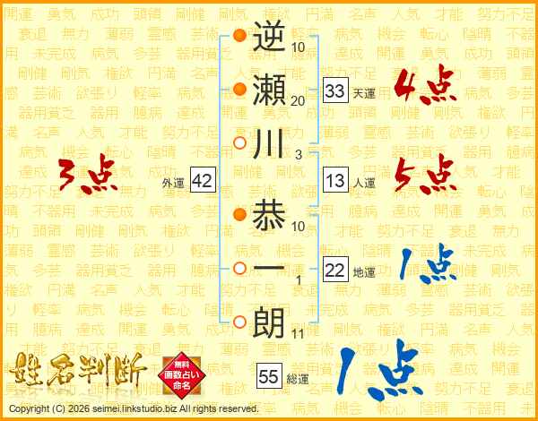 逆(10画)瀬(20画)川(3画) 恭(10画)一(1画)朗(11画)