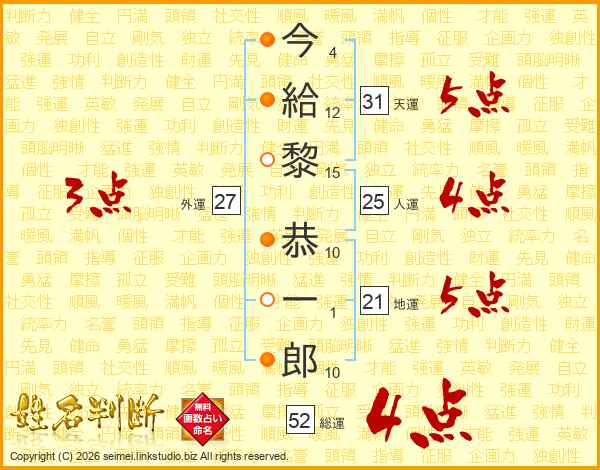 今(4画)給(12画)黎(15画) 恭(10画)一(1画)郎(10画)