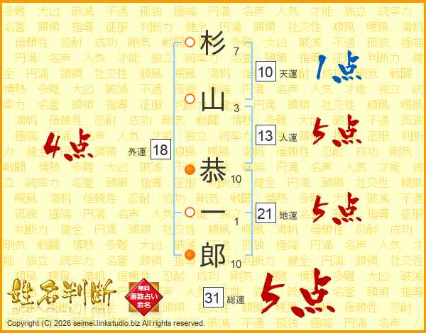 杉(7画)山(3画) 恭(10画)一(1画)郎(10画)