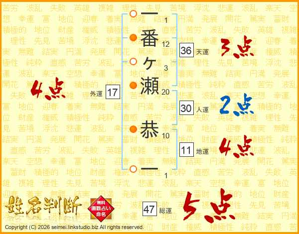 一番ヶ瀬恭一さんの総運は47画の5点!