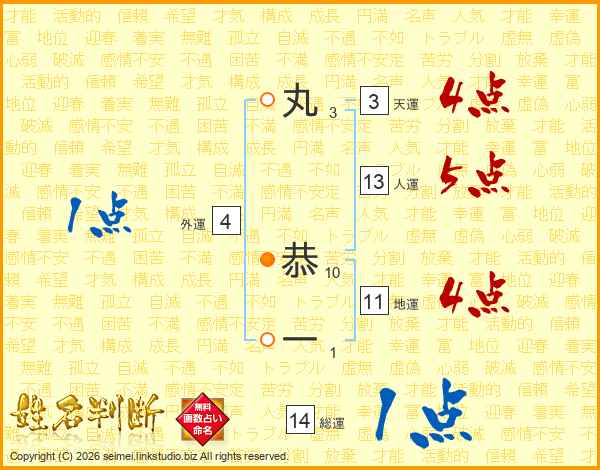 生活面を象徴する運勢です。外部から受ける影響力を表し、結婚運、家庭運や職場、環境への順応性を表します。総運から人運を引いた画数。姓や名が1文字の場合を除く。