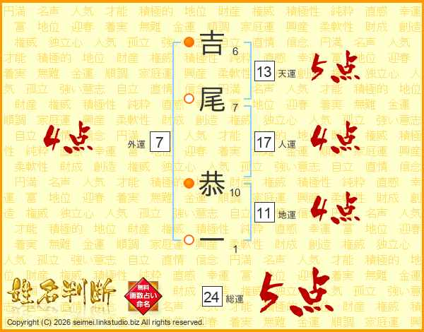 吉(6画)尾(7画) 恭(10画)一(1画)