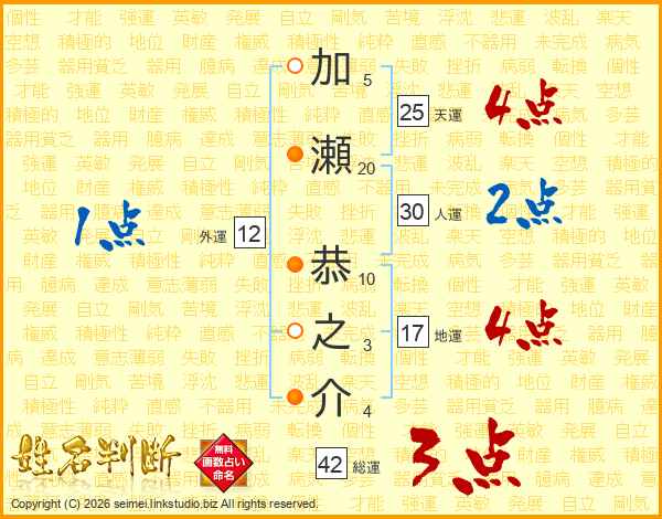 加瀬恭之介さんの天運は25画の4点!