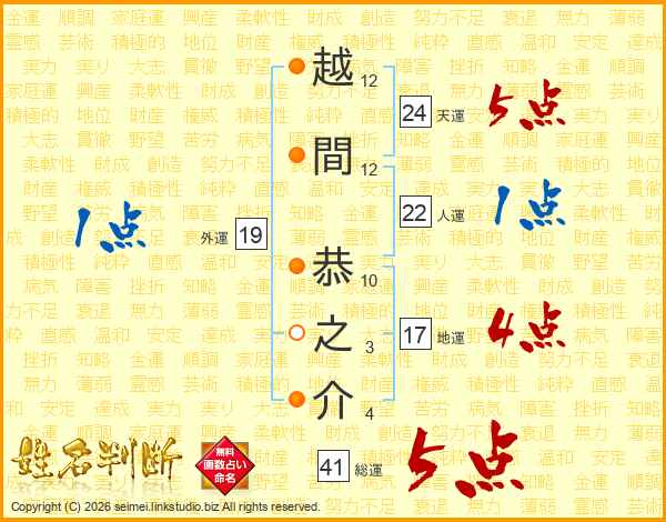 越(12画)間(12画) 恭(10画)之(3画)介(4画)