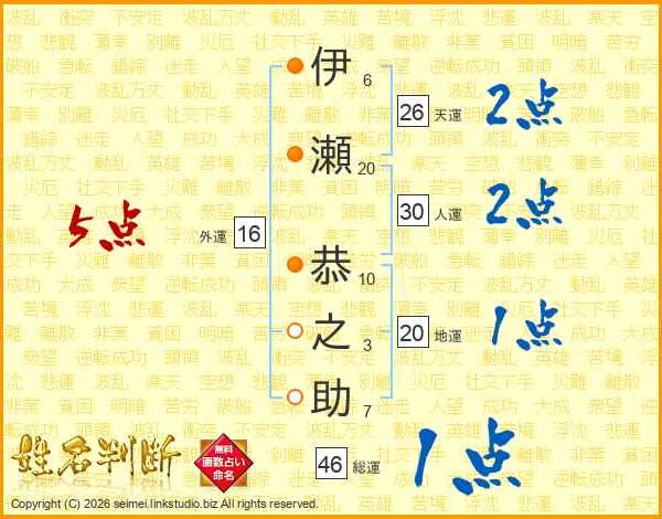 伊瀬恭之助さんの総運は46画の1点!