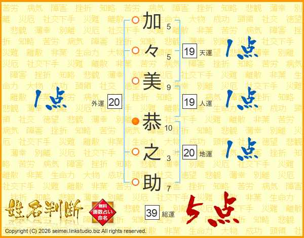 加(5画)々(5画)美(9画) 恭(10画)之(3画)助(7画)