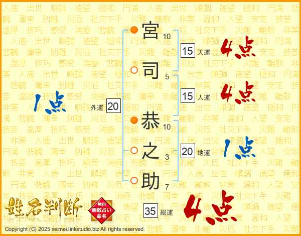 宮(10画)司(5画) 恭(10画)之(3画)助(7画)
