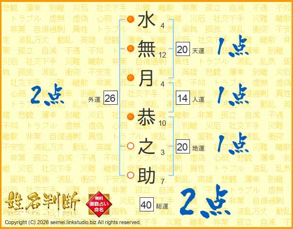 水(4画)無(12画)月(4画) 恭(10画)之(3画)助(7画)