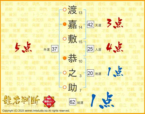 渡(13画)嘉(14画)敷(15画) 恭(10画)之(3画)助(7画)