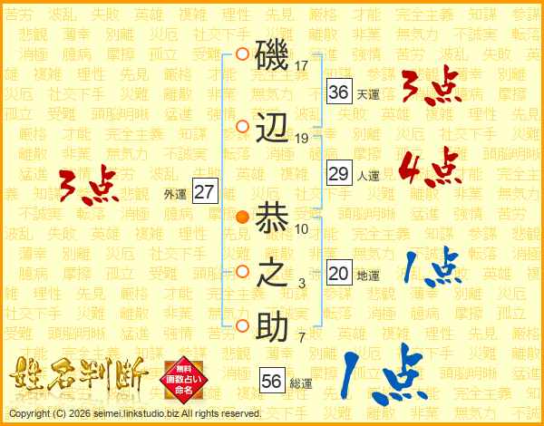 磯(17画)辺(19画) 恭(10画)之(3画)助(7画)