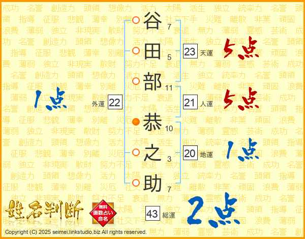 谷(7画)田(5画)部(11画) 恭(10画)之(3画)助(7画)