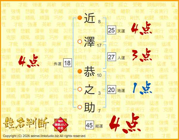 近(8画)澤(17画) 恭(10画)之(3画)助(7画)