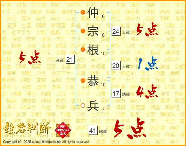 仲(6画)宗(8画)根(10画) 恭(10画)兵(7画)