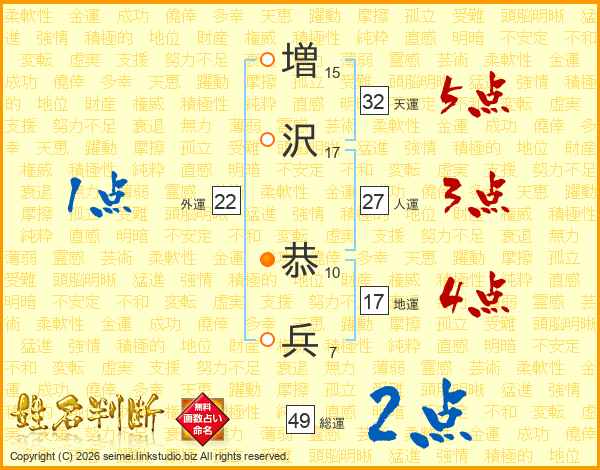増(15画)沢(17画) 恭(10画)兵(7画)