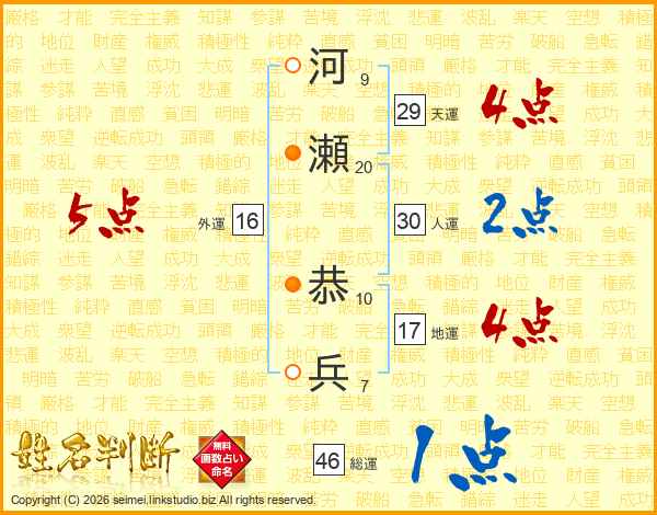 河(9画)瀬(20画) 恭(10画)兵(7画)