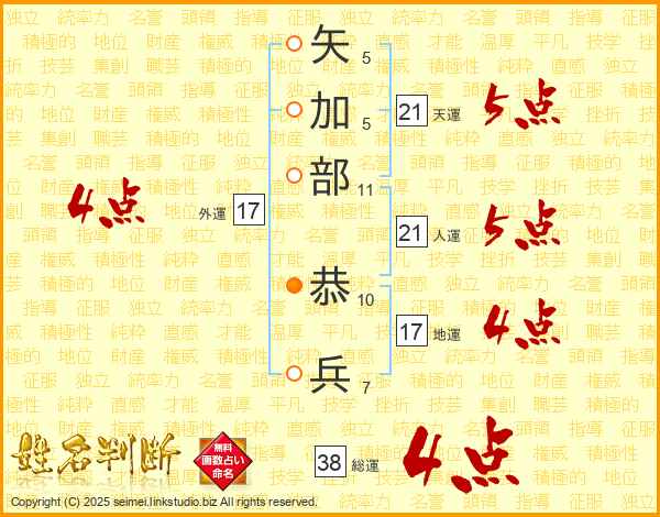 生活面を象徴する運勢です。外部から受ける影響力を表し、結婚運、家庭運や職場、環境への順応性を表します。総運から人運を引いた画数。姓や名が1文字の場合を除く。