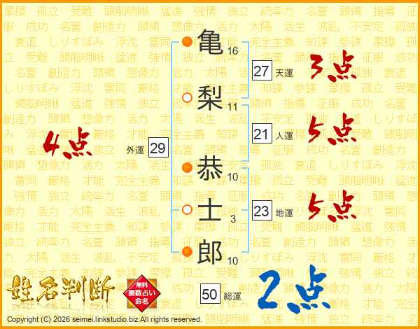 亀(16画)梨(11画) 恭(10画)士(3画)郎(10画)