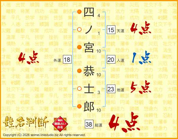 四(4画)ノ(1画)宮(10画) 恭(10画)士(3画)郎(10画)