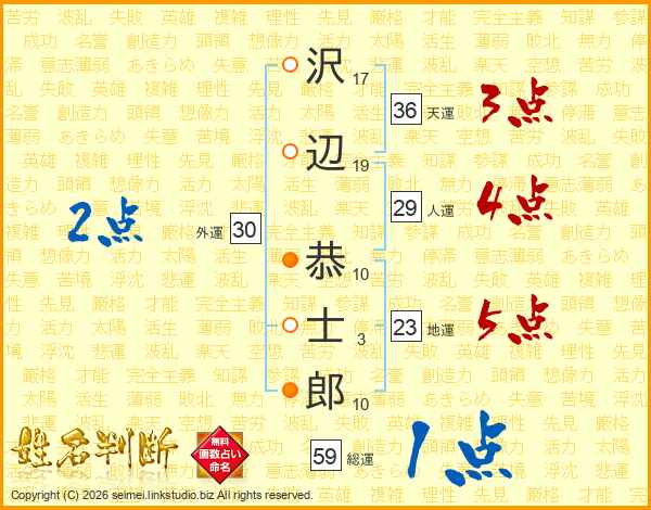 沢(17画)辺(19画) 恭(10画)士(3画)郎(10画)