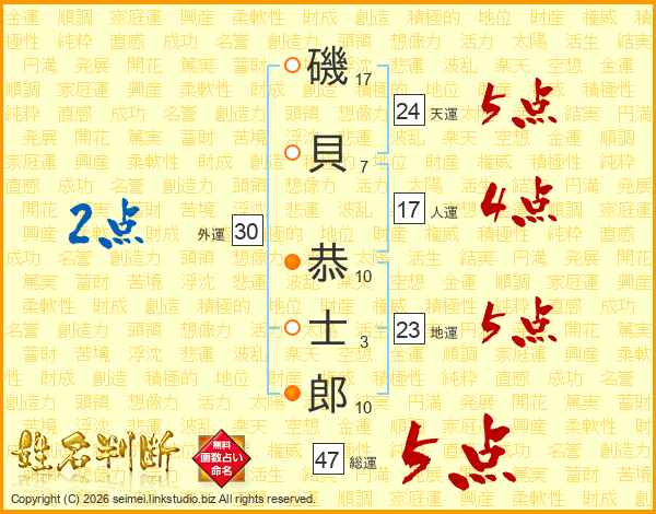 磯貝恭士郎さんの総運は47画の5点!
