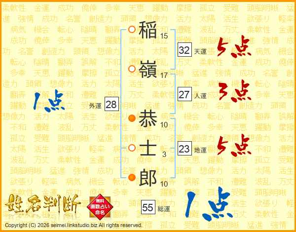 稲(15画)嶺(17画) 恭(10画)士(3画)郎(10画)