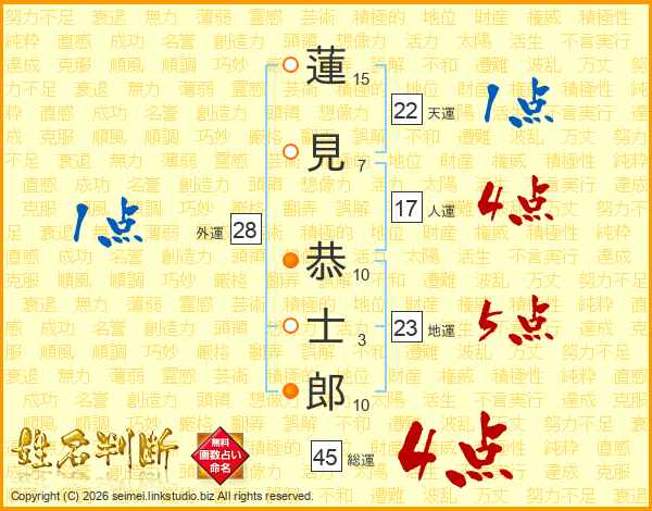 蓮(15画)見(7画) 恭(10画)士(3画)郎(10画)