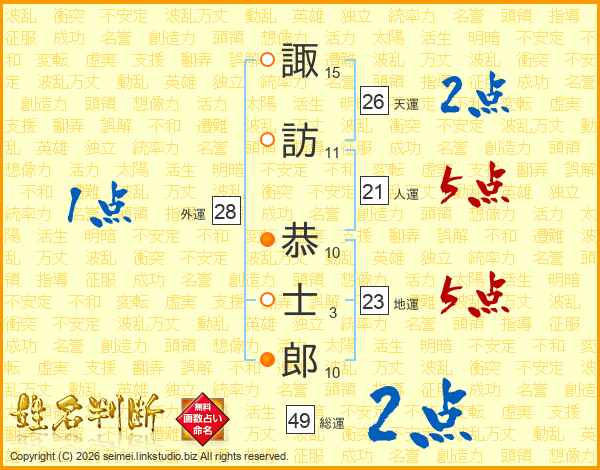 諏(15画)訪(11画) 恭(10画)士(3画)郎(10画)