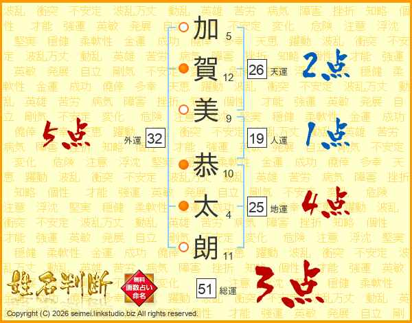 加(5画)賀(12画)美(9画) 恭(10画)太(4画)朗(11画)