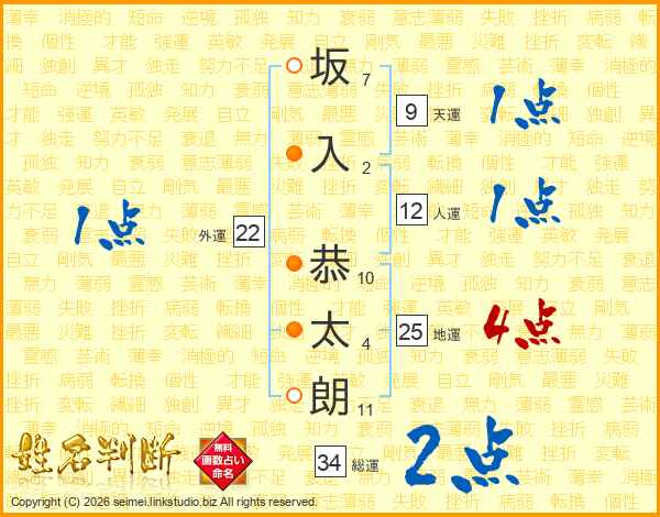坂(7画)入(2画) 恭(10画)太(4画)朗(11画)