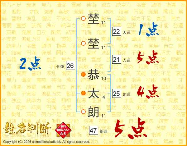 あなたの人生を表す1番重要な運勢です。生涯を通じて影響する総合運となり、主に50歳以降の晩年期に影響を及ぼします。苗字と名前の合計画数。