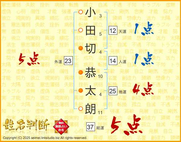 小(3画)田(5画)切(4画) 恭(10画)太(4画)朗(11画)