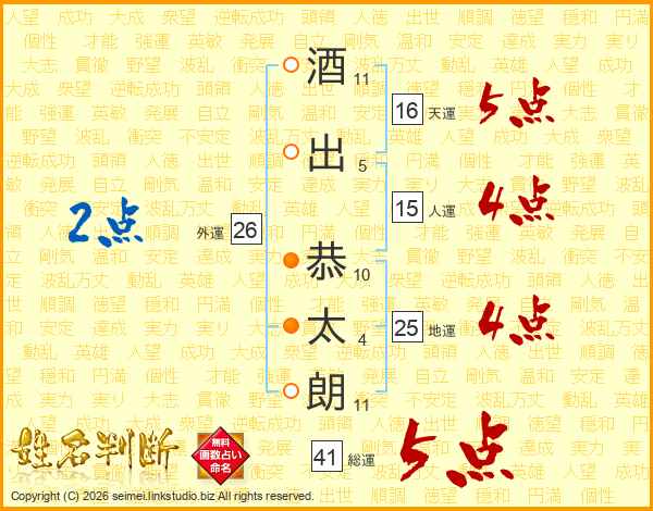 酒(11画)出(5画) 恭(10画)太(4画)朗(11画)