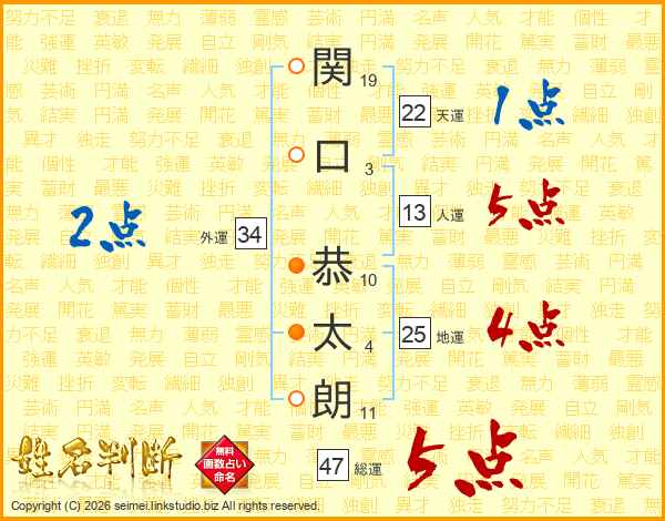 関(19画)口(3画) 恭(10画)太(4画)朗(11画)