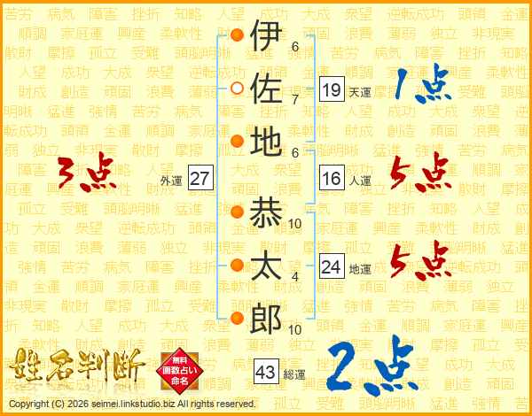 伊(6画)佐(7画)地(6画) 恭(10画)太(4画)郎(10画)